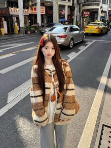 韩版复古条纹连帽卷卷仿羊羔毛毛外套女秋冬松弛毛呢长袖开衫上衣