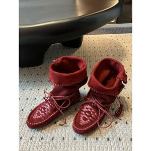 牛皮内增高复古流苏绑带西部靴女真皮编织中筒堆堆靴子折边马丁靴