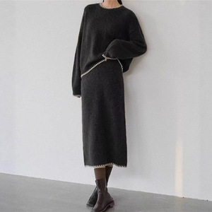外贸跨境秋冬圆领气质套装女式针织毛衣半身裙时尚新款宽松两件套