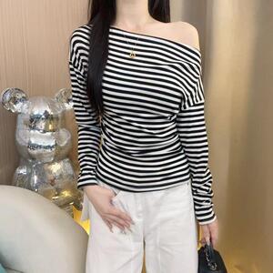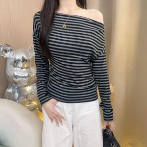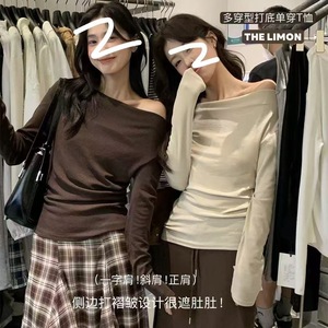 韩式慵懒一字肩长袖恤女秋季感小众不撞款收腰显瘦斜肩