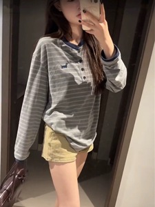 韩系复古学院风条纹撞色新款纽扣长袖t恤衫女秋2025新款百搭上衣