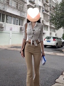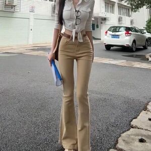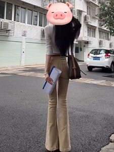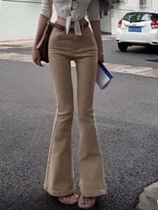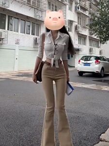 美式复古微喇牛仔裤女春季新款高腰修身显瘦卡其色百搭阔腿拖地裤