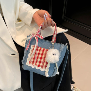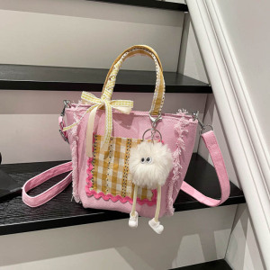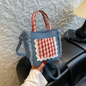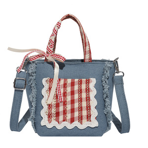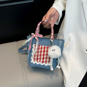 韩系新款手提包拼色亲子包单肩时尚牛仔可爱撞色格纹手拎包斜挎包
