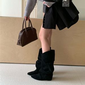 时尚绒面褶皱堆堆靴女2025年秋冬新款尖头西部牛仔靴翻领中筒靴女