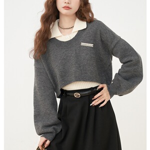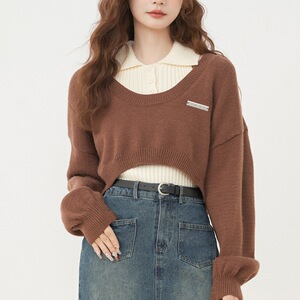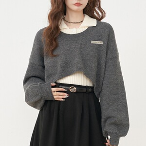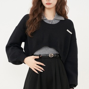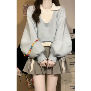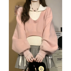 美式复古针织衫秋冬新款设计感外穿高腰短款毛衣罩衫叠穿两件套女