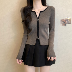 双拉链设计感撞色针织开衫女2025秋装新款内搭修身显瘦毛衣A6501