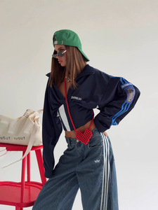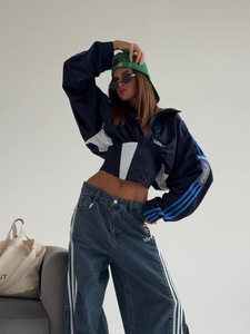 跨境欧美缎面紧身夹克女热销短款收腰夹克侧边条纹设计复古潮流