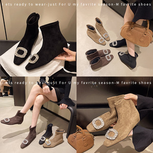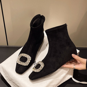 8071-1黑色方头短靴女2025冬新款方扣水钻弹力袜靴子粗跟瘦瘦靴女