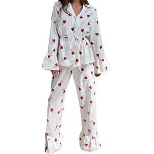 纯棉提花长袖长裤爱心印花荷叶边睡衣套装2025欧美秋季新款家居服