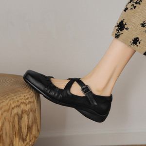 法式复古方头玛丽珍鞋女2025年新款真皮粗跟交叉带软底单鞋