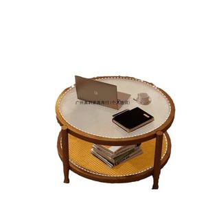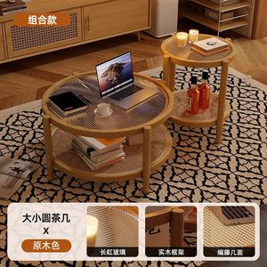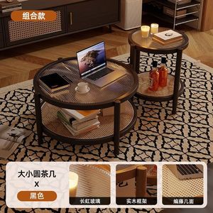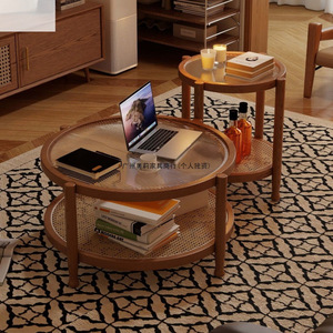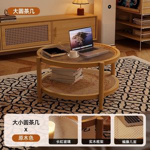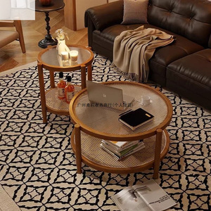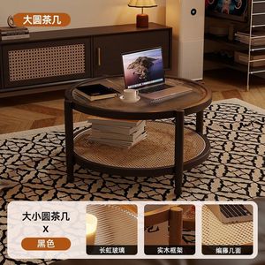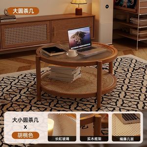 胡桃复古风侘寂藤编茶几极简现代茶几实木家用小户型长虹玻璃客厅