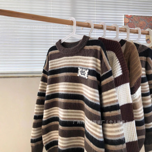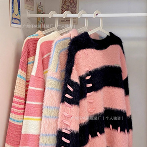 十三行慵懒风条纹水貂绒毛衣女秋冬季宽松设计感小众毛茸茸厚上衣