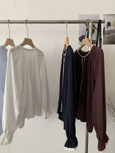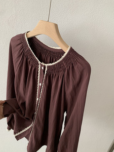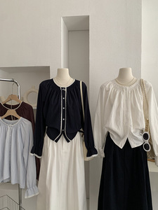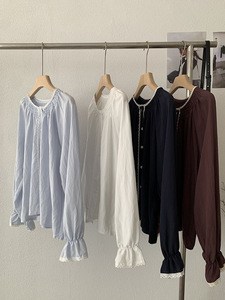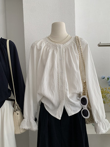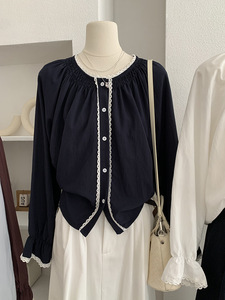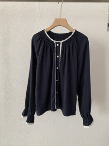 欧玛莱 小清新拼接蕾丝花边领宽松长袖纯色单排扣衬衫上衣女 4551