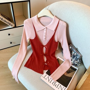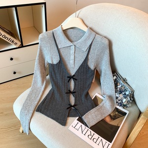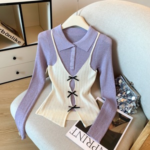 韩系撞色假两件polo领长袖针织衫早秋修身蝴蝶结设计感上衣