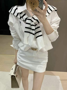 RL小马套装女妹条纹披肩衬衫褶皱连衣裙(配披肩腰带)三件套高级