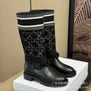 刺绣字母骑士靴长靴女早秋新款拼色不过膝高筒针织靴子