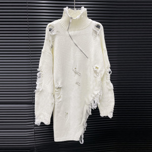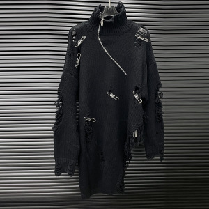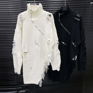 2025早秋新款半拉链高领别针破洞毛衣女韩系时尚不规则小众设计感