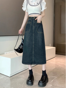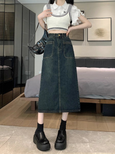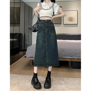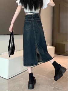 美式复古牛仔半身裙女春秋新款高腰开叉包臀裙中长款直筒a字裙子