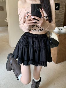 蕾丝花边丝绒蛋糕短裙女秋冬木耳边松紧腰蓬蓬裙芭蕾风甜美半身裙