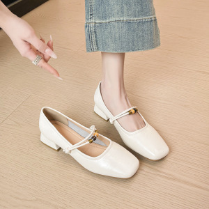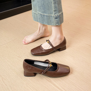 法式复古浅口单鞋女2025新款方头配裙子百搭粗跟棕色玛丽珍鞋