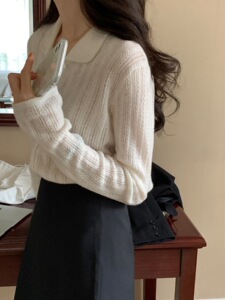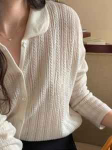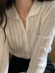 春秋冬薄款翻领设计感小众长袖针织开衫上衣镂空外搭毛衣女短外套