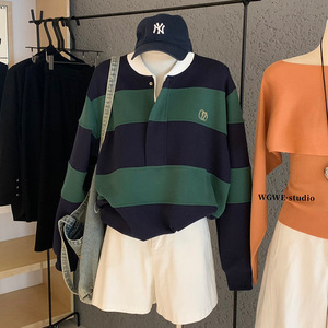WGWE6897学院风翻领百搭条纹POLO宽松软糯刺绣减龄上衣