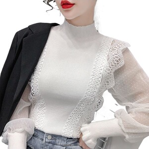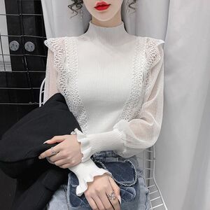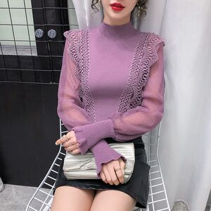 2025秋季新款洋气百搭修身显瘦钩花网纱灯笼袖拼接长袖针织衫女潮