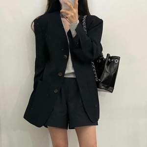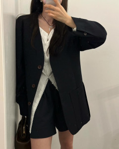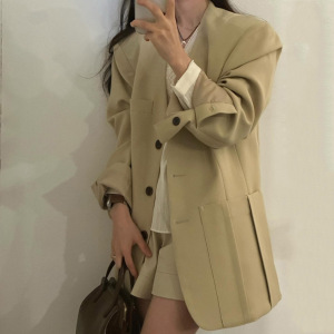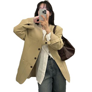 韩国ins早秋法式气质感百搭通勤单排扣褶皱双口袋V领宽松西装外套