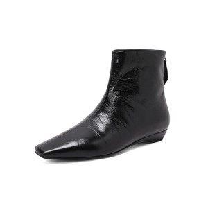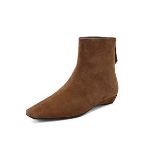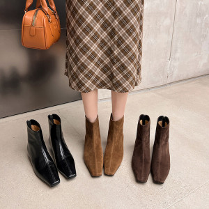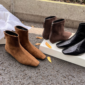 头层牛皮/羊反方头单靴女瘦瘦靴 新款真皮后拉链低跟女短靴及裸靴