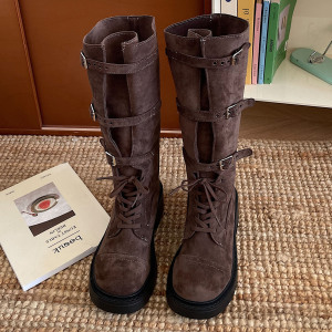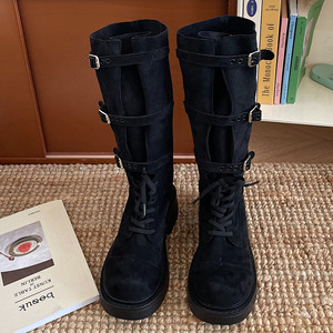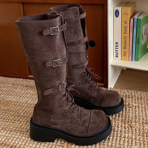 2025秋季新款绒面骑士靴复古百搭堆堆长靴皮带扣小众慵懒风高筒靴