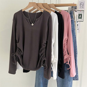 奥特莱斯~早秋V领锁骨长袖内搭T恤女独特别致抽绳修身短款上衣服