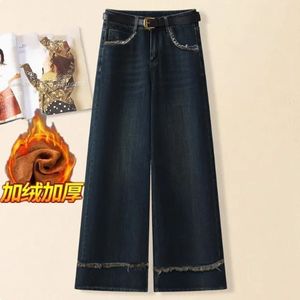 加绒复古深蓝色阔腿牛仔裤女秋冬季新款高腰宽松垂感毛边直筒裤潮