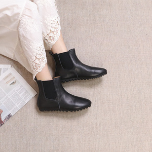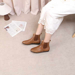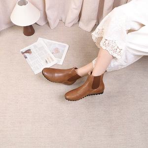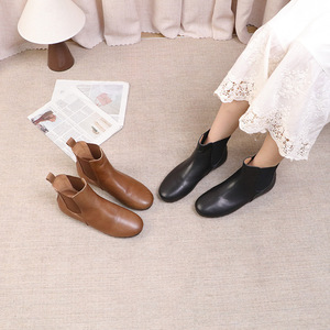 9168-2 文艺风真皮短靴女平底底跟黑棕双色简约韩系女鞋