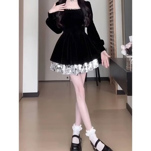 小黑连衣裙女秋冬亮片方口领赫本风2025新款显瘦气质收腰生日裙子