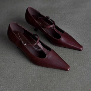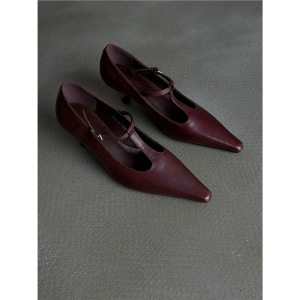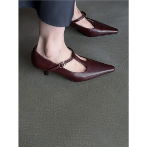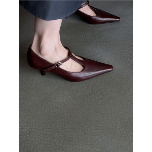 全羊皮~法式复古风小众百搭气质时尚丁字扣带尖头粗跟浅口单鞋女