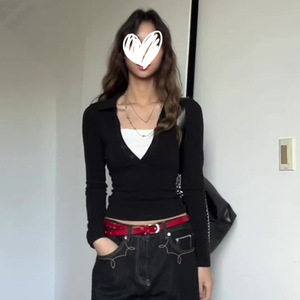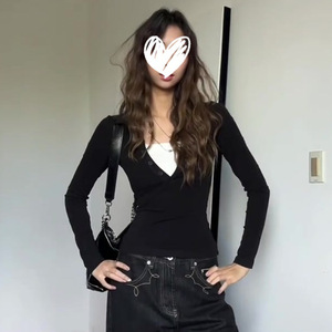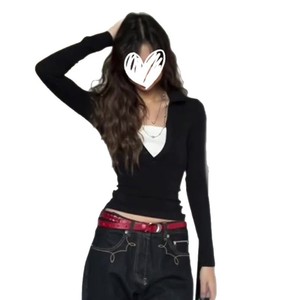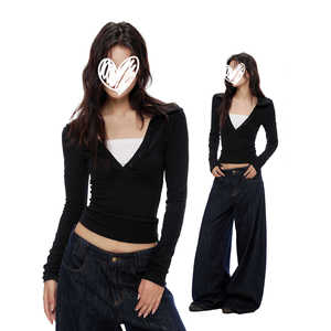 韩系穿搭假两件拼接撞色长袖T恤修身显瘦辣妹设计感女上衣潮