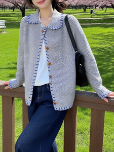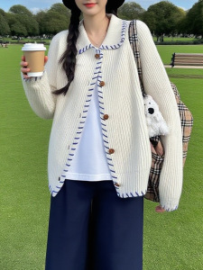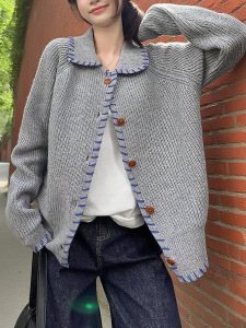 2025秋冬新款撞色设计感翻领坑条毛衣外套女宽松休闲百搭针织开衫