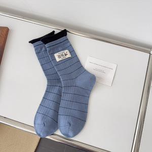 双罗口条纹布标袜子女春秋季ins潮韩系中筒袜棉质学院风布标长筒