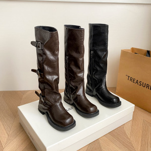 胖mm长筒靴女大码西部牛仔靴厚底废土风粗腿大筒围长靴裤管骑士靴