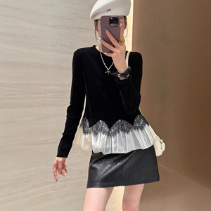 爆款25秋冬新款法式拼接蕾丝百褶荷叶边植绒上衣版型修身显瘦小衫