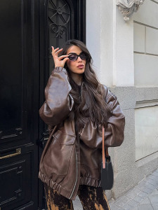 复古风简约气质皮面翻领夹克外套女2025跨境欧美风秋冬新款批发