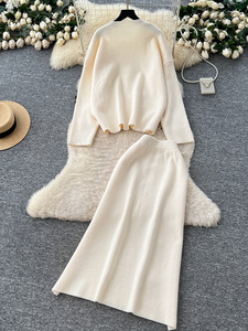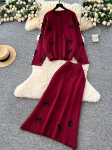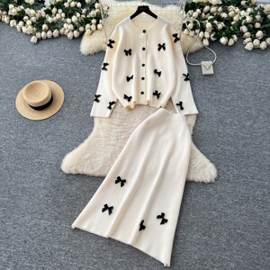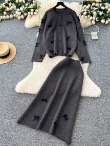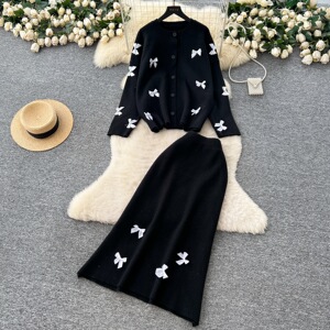 感毛衣两件套女秋冬慵懒风宽松休闲蝴蝶结长袖针织上衣半身裙