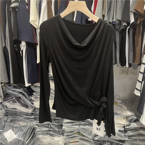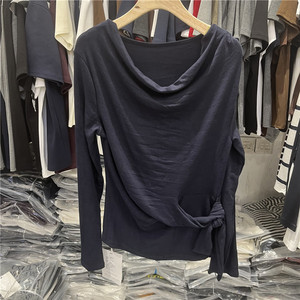 设计感条纹荡领长袖T恤女2025秋季一字肩侧绑带打底衫上衣百搭
