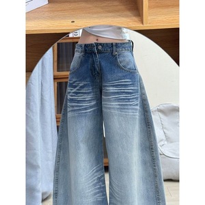 小个子美式口袋刺绣阔腿牛仔裤女秋季低腰宽松直筒拖地裤
