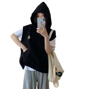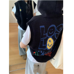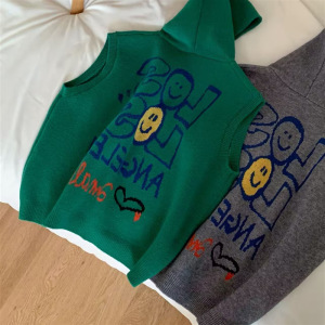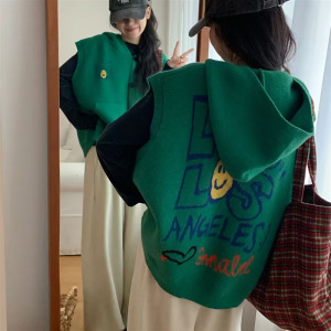 秋冬新款笑脸字母提花宽松针织马甲开衫背心连帽毛衣马夹坎肩女潮