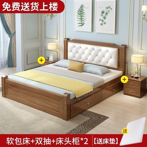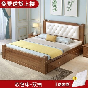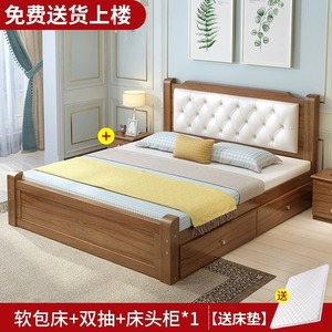 实木床+床垫+双抽【胡桃色】