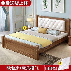 实木床+床垫+床头柜x1【胡桃色】