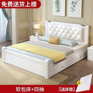 实木床+床垫+四抽【暖白色】