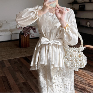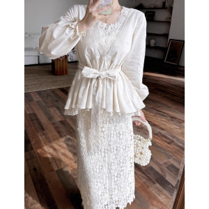 锦倩-觉华莲-秋季新款法式V领蕾丝拼接长袖上衣蕾丝高腰半身裙 潮
