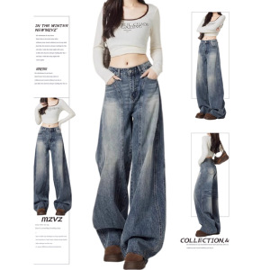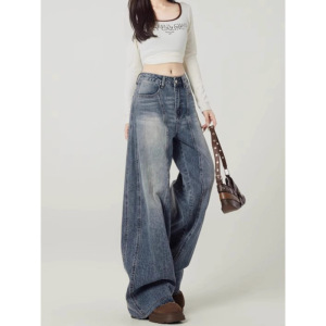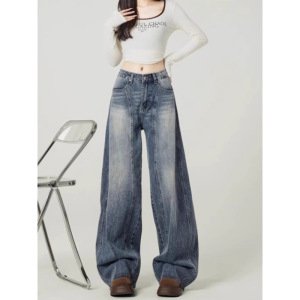 大码复古蓝弯刀阔腿牛仔裤女早春季设计感镰刀裤宽松显瘦垂感裤子